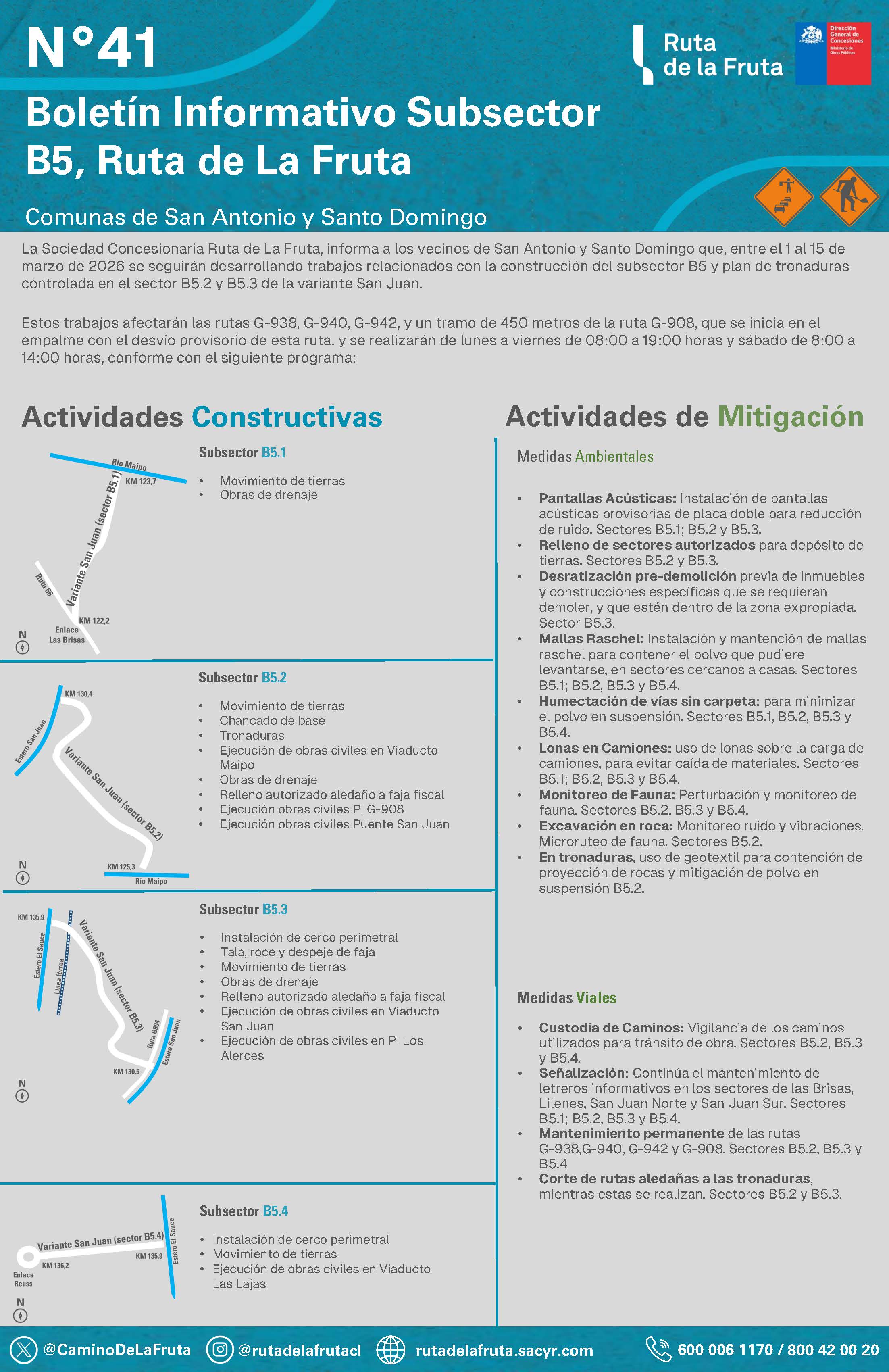 La Sociedad Concesionaria Ruta de La Fruta, informa a los vecinos de San Antonio y Santo Domingo que se seguirán desarrollando trabajos relacionados con la construcción del subsector B5 y plan de tronaduras controlada en el sector B5.2 y B5.3 de la variante San Juan.