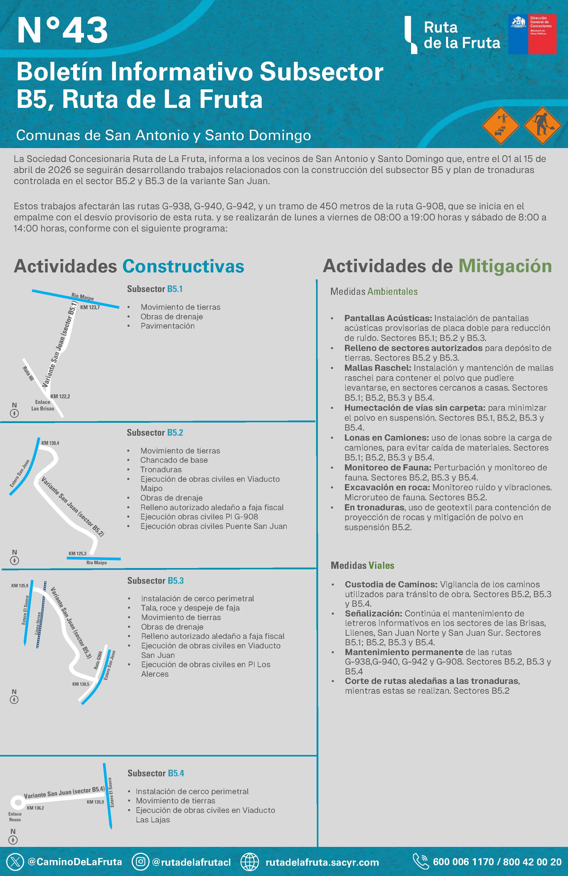 La Sociedad Concesionaria Ruta de La Fruta, informa a los vecinos de San Antonio y Santo Domingo que se seguirán desarrollando trabajos relacionados con la construcción del subsector B5 y plan de tronaduras controlada en el sector B5.2 y B5.3 de la variante San Juan.