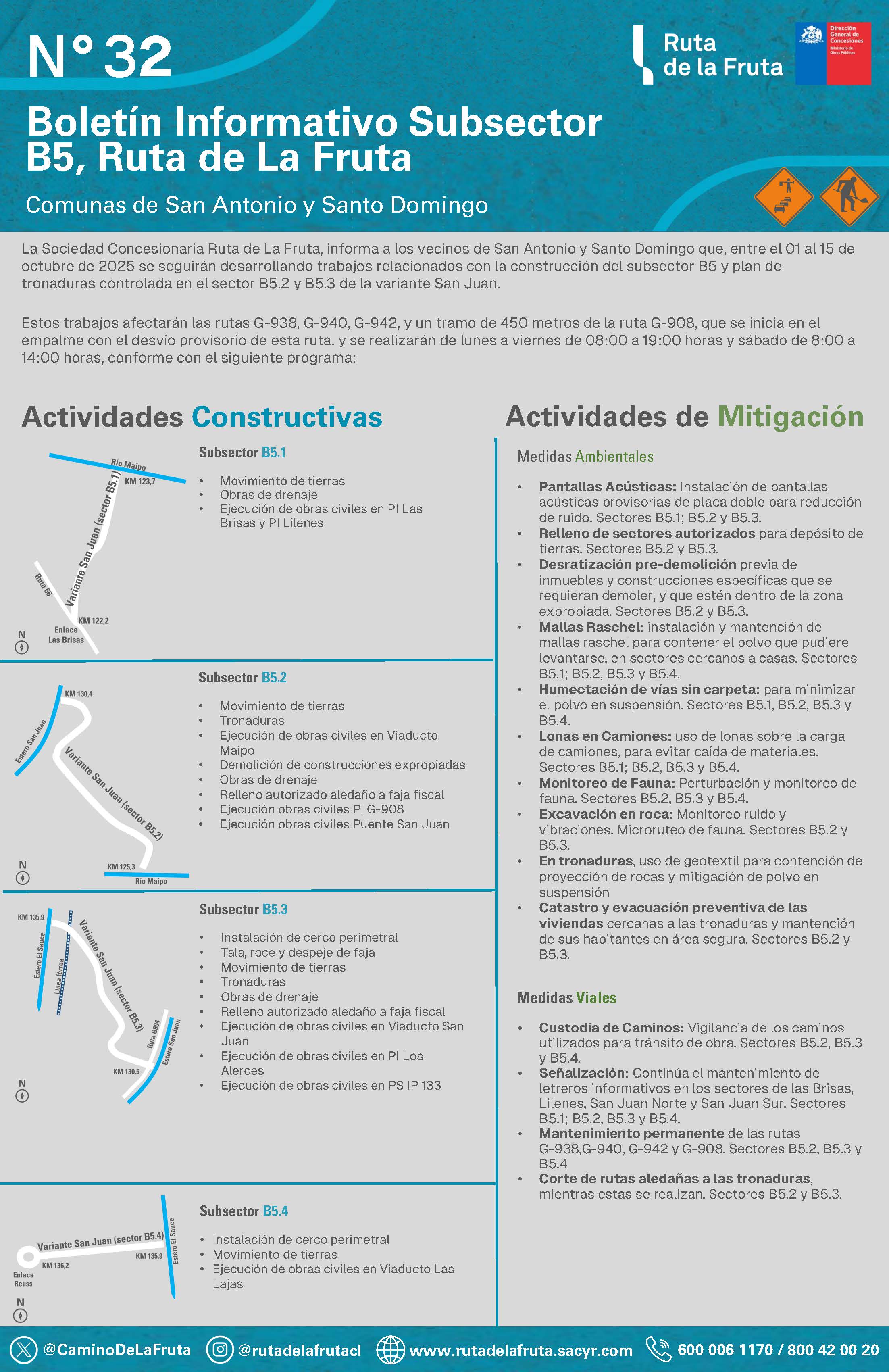 La Sociedad Concesionaria Ruta de La Fruta, informa a los vecinos de San Antonio y Santo Domingo que, entre el 01 al 15 de octubre de 2025 se seguirán desarrollando trabajos relacionados con la construcción del subsector B5 y plan de tronaduras controlada en el sector B5.2 y B5.3 de la variante San Juan.