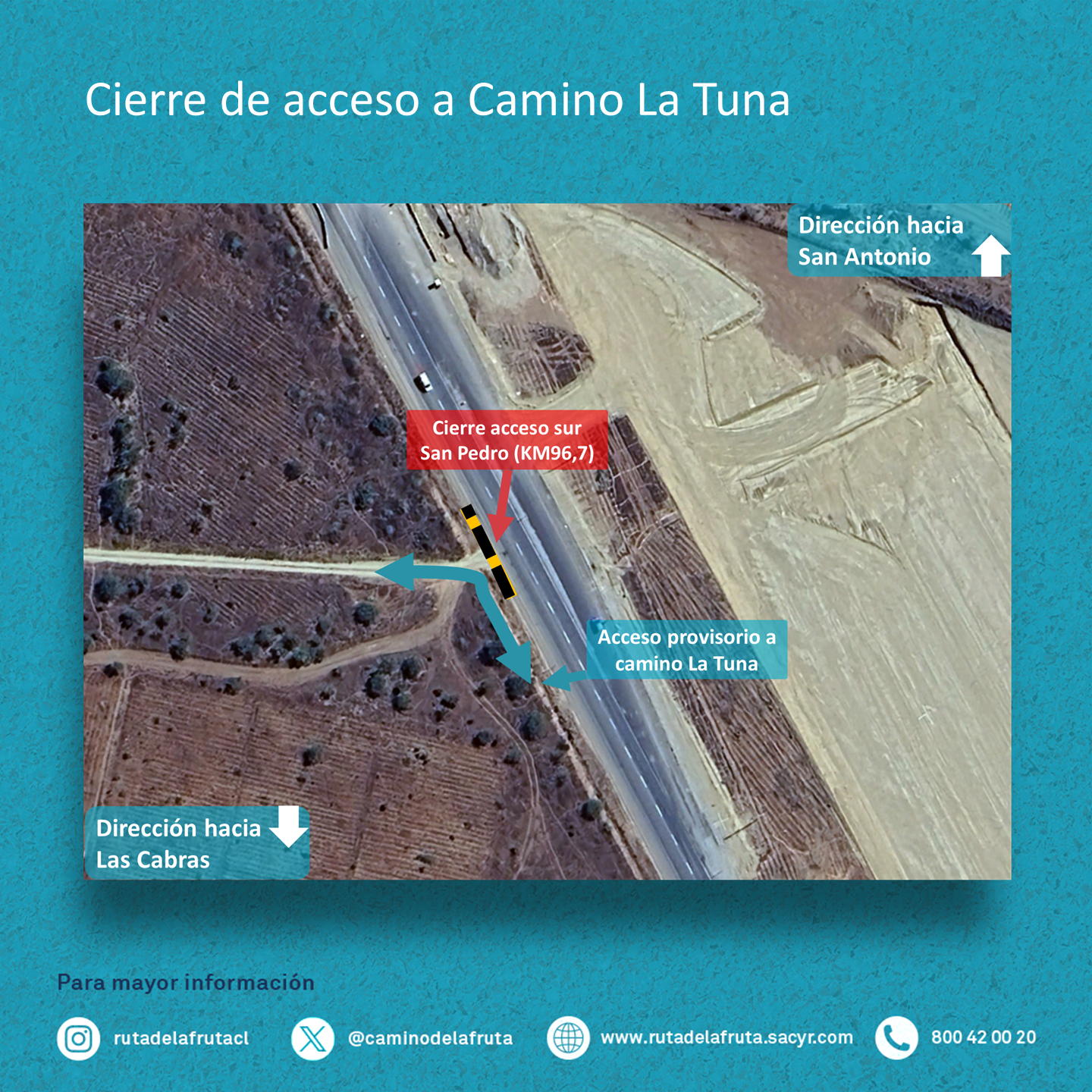 El Ministerio de Obras Públicas, la Dirección General de Concesiones y la Sociedad Concesionaria Ruta de La Fruta, informan a los usuarios y a la comunidad que, debido a las precipitaciones, el acceso al Camino La Tuna, se cerró y se dispuso como conexión un