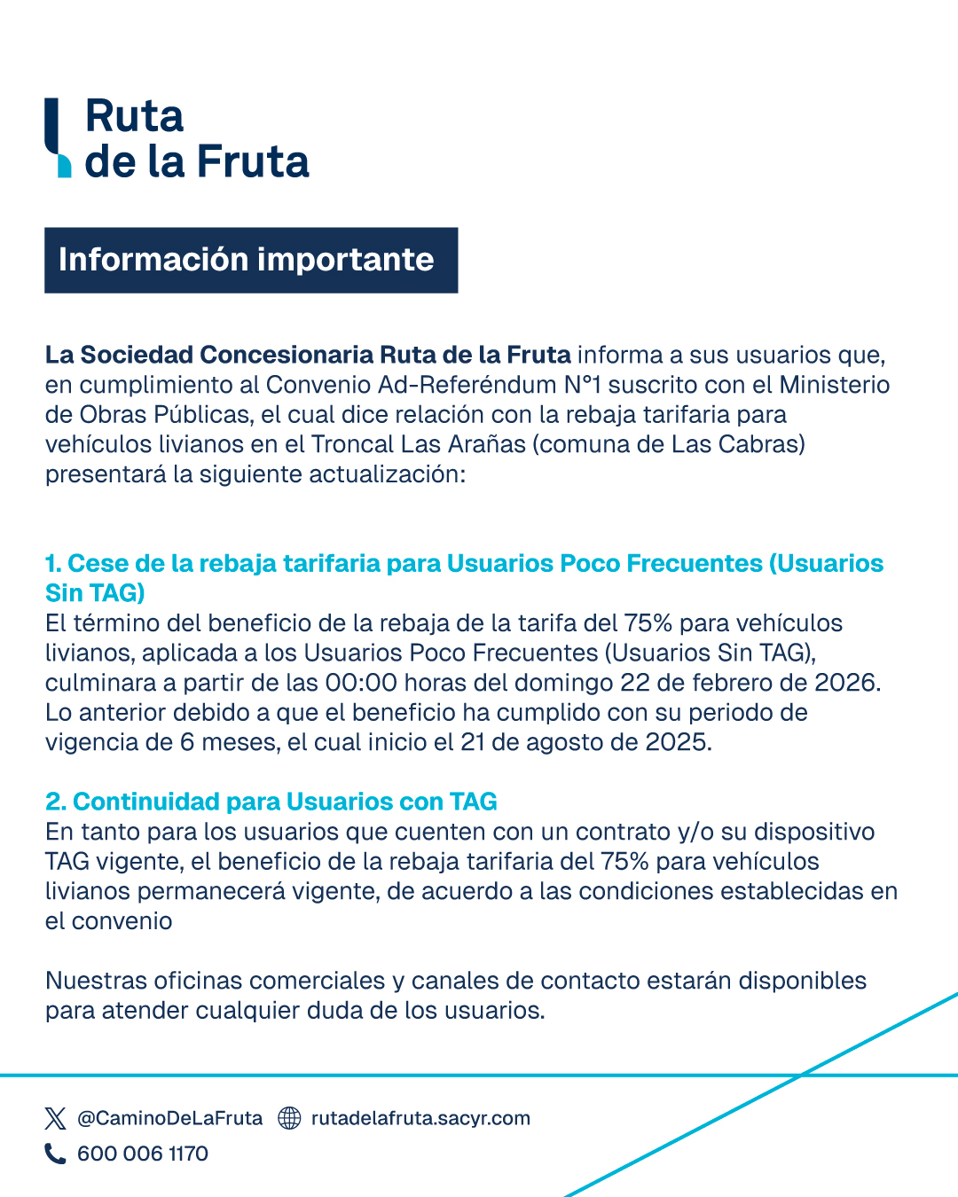 La Sociedad Concesionaria Ruta de la Fruta informa a sus usuarios que, en cumplimiento al Convenio Ad-Referéndum N°1 suscrito con el Ministerio de Obras Públicas, el cual dice relación con la rebaja tarifaria para vehículos livianos en el Troncal Las Arañas (comuna de Las Cabras) presentará la siguiente actualización:
