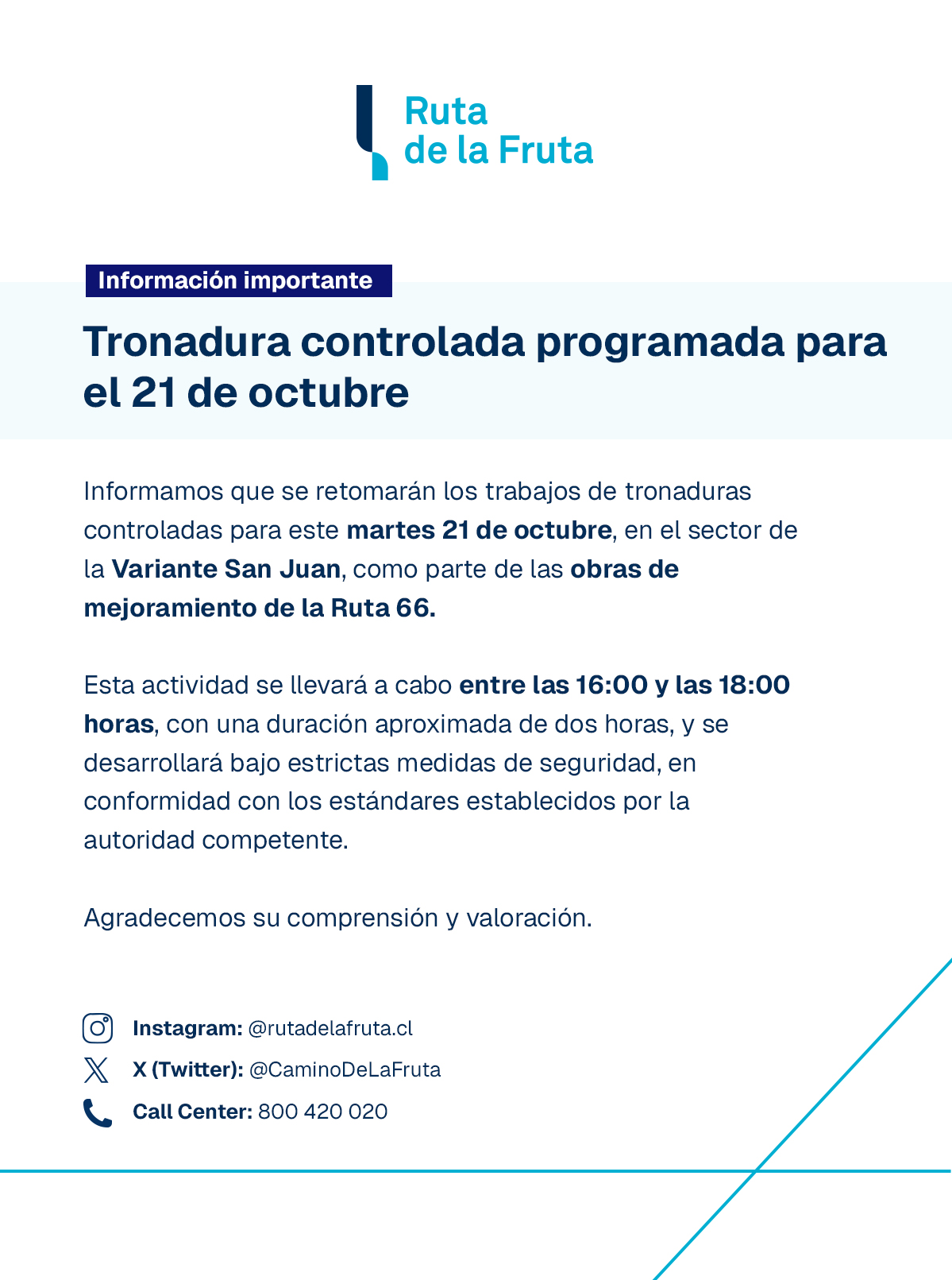 Ruta de la FrutaNoticiasRuta de La Fruta: Trabajos de tronaduras controladas martes 21 de octubre 2025