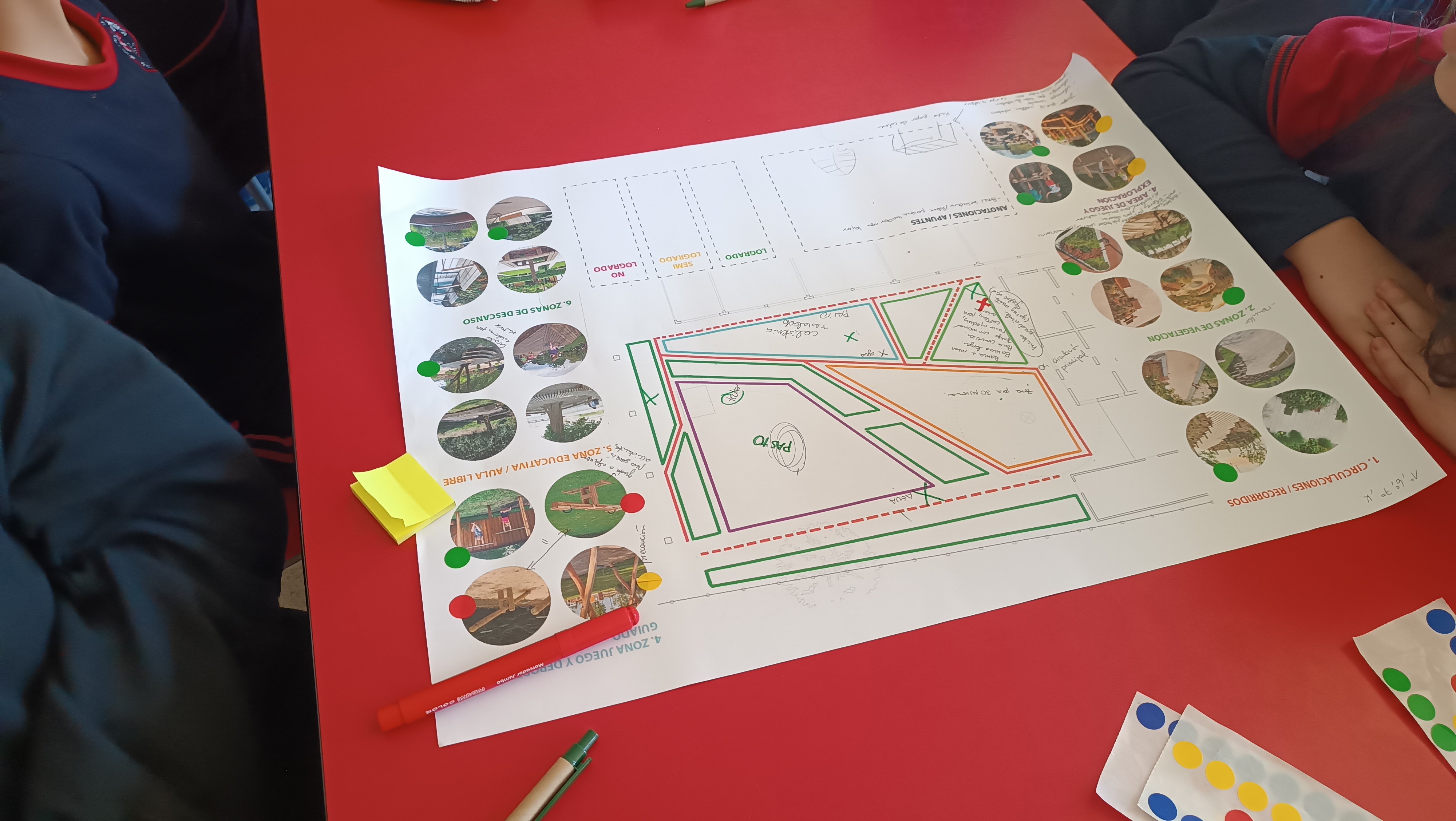 Durante la jornada, los alumnos expresaron sus necesidades y sueños mediante tarjetas de ideas, que luego fueron expuestas en un simbólico “Árbol de los sueños”. Con el acompañamiento de monitores de Fundación Mi Parque, se guiaron las decisiones del alumnado, enriqueciendo los planos con propuestas como nuevas áreas de juego, zonas de picnic, mayor vegetación, senderos y espacios destinados a hierbas y huertos.