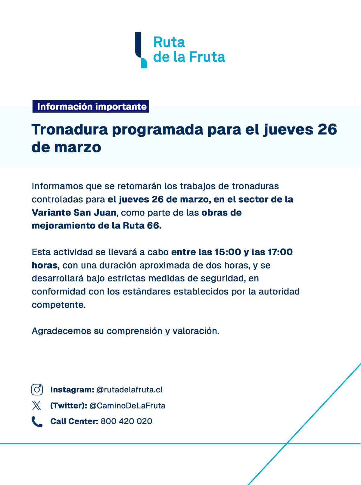 Trabajos de tronaduras controladas jueves 26 de marzo de 2026